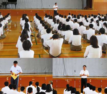 全校集会の様子です。専門委員長からの報告、学校祭実行委員会のテーマの発表、校長先生、生徒指導部の先生のお話の様子です。