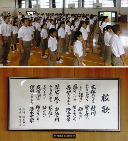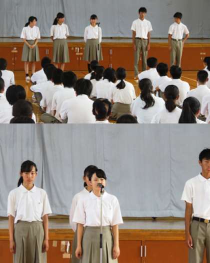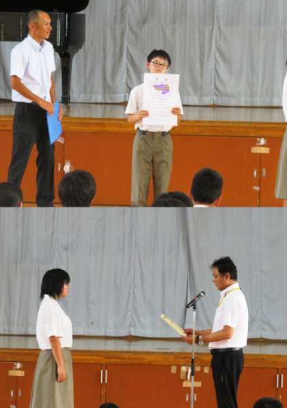 1学期最終の全校集会が行われました。校歌斉唱に続いて、表彰が行われました。表彰は「合同球技大会・NHK杯全国中学校放送コンテスト朗読部門」です。その後、生徒会より、生徒会長や各専門委員長から1学期のお礼と2学期最初の生活向上週間の説明、学校祭実行委員会より今年度の学校祭のテーマが発表されました。そして、校長先生、生徒指導部の先生から夏休みの生活等についての話がありました。写真は、校歌斉唱、表彰、生徒会の様子です。
