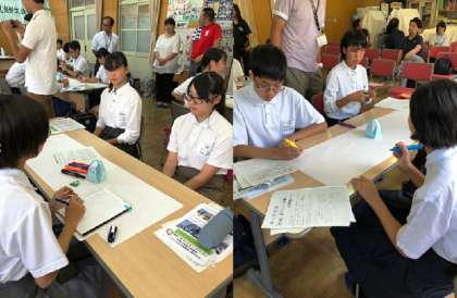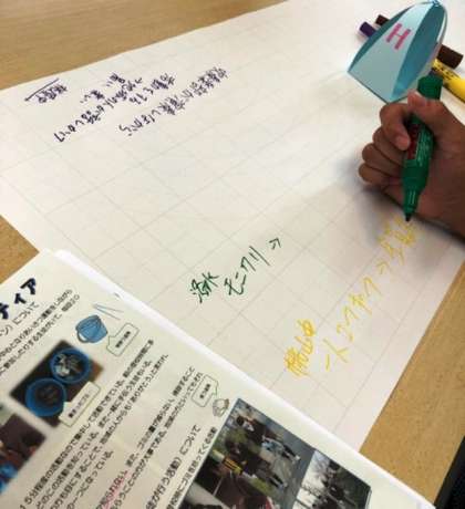 全体で各校の取り組みについて発表し、ワールドカフェ方式で話し合いをしています。
