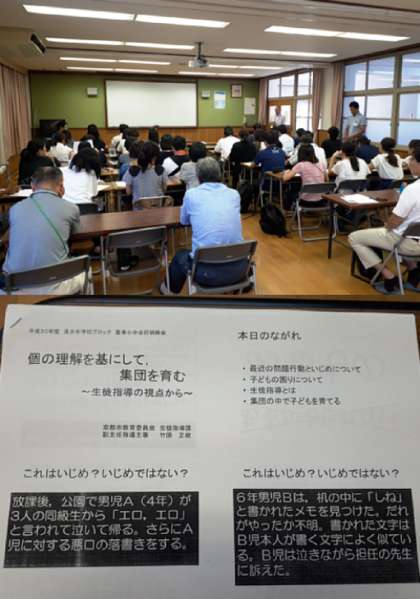 洛水中学校ブロック夏季小中合同研修会が本日(8月22日)の午後、納所層学校にて行われました。今年度は、「社会性を身につけ、自己実現ができる児童・生徒〜重点学習や生活の香かで、規範意識や社会性を育てよう、ルールや規律などを確実に身につけさせる始動に向けて〜」を研究主題に研修会を行いました。始めは教育委員会から指導主事の方に「個の理解をもとにして、集団を育む」をテーマにご講演して頂きました。