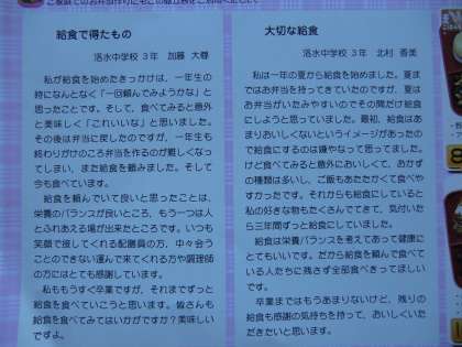明日配布予定の選択性・中学校給食「3月のメニュー」に本校の生徒の作文が載ります。給食に関わって下さっている方への感謝や給食の栄養バランスや味について書かれた「給食賛歌」です。