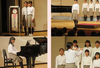 私たちのクラスの曲は、『変わらないもの』です。練習では、なかなか音をとることが上手くいかなかったり、みんなの声がまとまらなかったりしました。でも、先生からアドバイスをもらい、自分たちで考え合い少しずつ変わっていくことが出来ました。時には、仲間同士で言い合いしたりしました。そんな時、私たちは題名にある「変わらないもの」とは何かを考えました。私たちにとっての変わらないものとは、みんなと出会えた幸せや離れたとしても決して消えない絆ではないかという意見が出ました。そんな、みんなと歌える喜びを感じながら、息を合わせて心を一つにして歌います。それでは聞いて下さい。