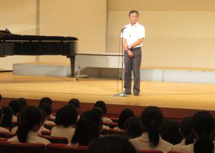 校長先生空のお話の後、学校祭実行委員会副委員長より、「みなさん、今日の合唱コンクールはどうでしたか。金賞をとれたクラスも、とれなかったクラスも今までの成果を全て出しきり、悔いのない最高の合唱コンクールとなったでしょうか。・・・ 合唱コンクール以外にもまだ2つの学校祭が残っています。1,2年生とくに3年生はこのメンバーで創る最後の思い出だと思うので、大人になっても思い出せるようなすばらしいものにしましょう。これを終わりの言葉とします。」と挨拶がありました。
