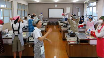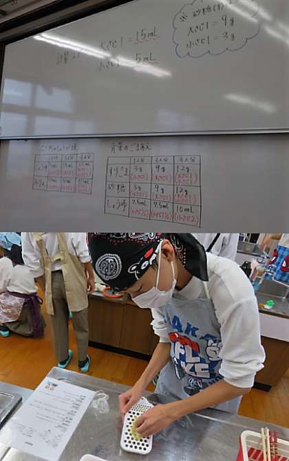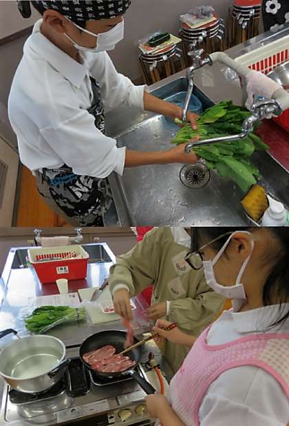 本日、2年生の調理実習が行われました。「豚肉のしょうが焼き」と「小松菜のごま和え」をみんなで楽しくつくりました。1限の2組の様子です。