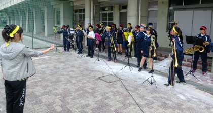 入場行進の様子です。吹奏楽の演奏で選手が入場しました。