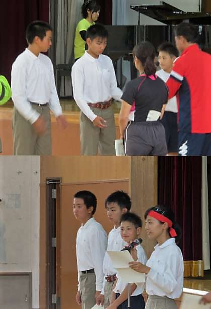 子どもたちは、教室で更衣をし、体育館で閉会式が行われました。体育委員長より成績発表が行われました。優勝チームは、1年1、3組、2年4組、3年3組 でした。おめでとうございます。表彰式の様子です。