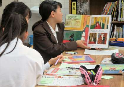6限の3組の家庭科の授業での読み聞かせの練習の様子です。