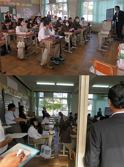 今週を授業研究週間として「主体的に学び、対話しながら課題解決をする力の育成〜意味の理解・知識のつながり・新しい気づきを持たせる学習指導の実践〜」を研究テーマに取り組んでいます。そこで、本日の6限に校内研究授業が1年3組(理科)、2年4組(英語)、3年4組(数学)で行われ、教育委員会から指導主事の先生に来校して頂きました。また、授業後の研究協議を行い、指導主事の先生からの指導・助言をいただきました。