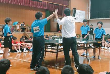 昨日(10月21日)、大宅中学校で卓球部の1年生大会予選が行われました。大会前に行われました、講習会の様子です。