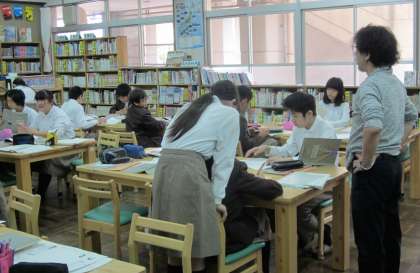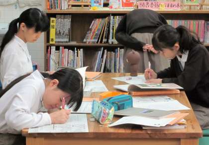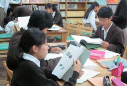 1限の1年3組の美術の授業が図書室で行われていました。この後、3限に2組、5限に4組の授業が行われます。