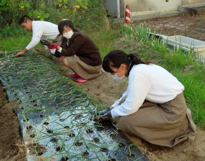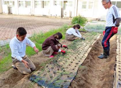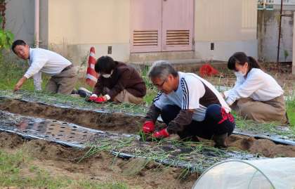 放課後の様子です。農園芸部は、タマネギの苗を植えていました。