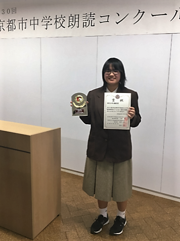 昨日(11月10日)に行われました京都市中学校総合文化祭 朗読コンクールに本校から1名の生徒が出場し、 現代文の部 最優秀賞をいただきました。おめでとうございます。