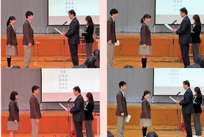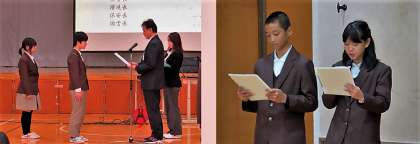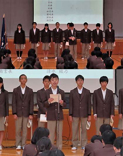 新生徒会本部を代表して生徒会長からの所信表明、校長先生からの後期代表・専門委員への認証状渡しの様子です。認証状渡しの時の司会者は新本部役員が行っていました。