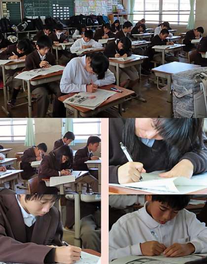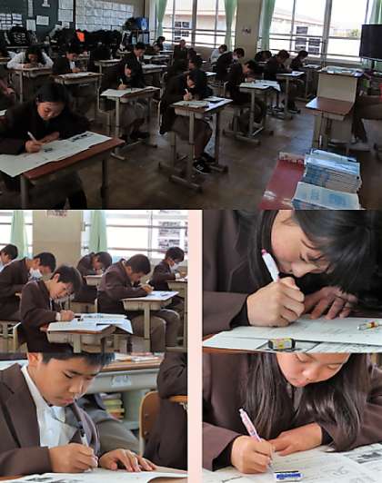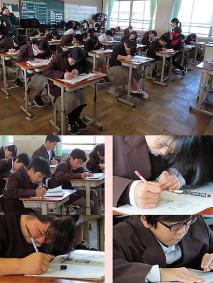 4限の1年生の美術のテストの様子です。上から、2組、3組、4組 です。