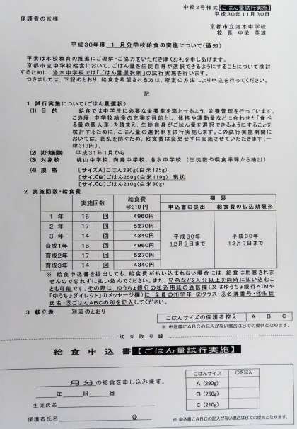 1月分の給食の申込みのお知らせを本日配布しました。1月より本校が「ごはん量試行実施校」となり、申込時にご飯の量を選択しての申込みとなります。申込用紙も少し変更しました。詳しくは、配布プリントをご覧ください。申込み等の〆切が12月7日(金)です。ご希望の場合は、期日までに手続きをお願いします。