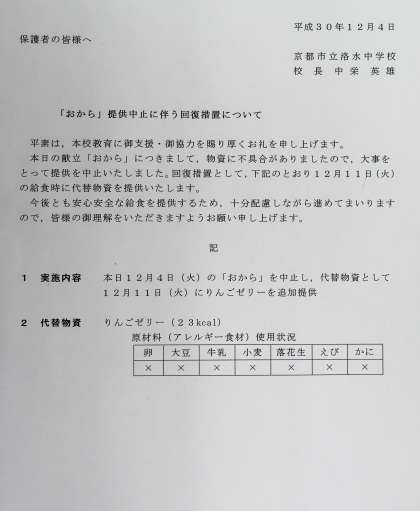 本日の献立「おから」につきまして,物資に不具合がありましたので,大事をとって提供を中止いたしました。回復措置として,下記のとおり12月11日(火)の給食時に代替物資を提供いたします。