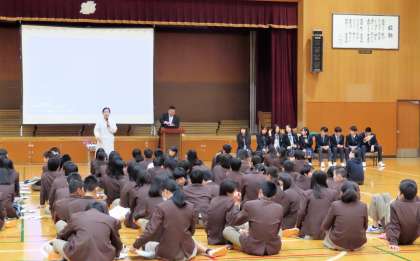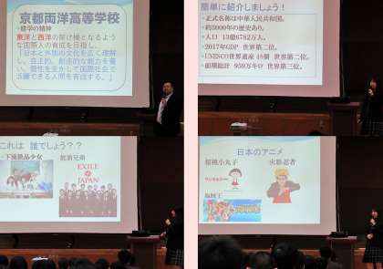 本日の午後、2年生は京都両洋高校の中国からの留学生に来て頂き、国際理解学習を行いました。5限は体育館で「学校や留学生の紹介、中国の紹介、中国語クイズ」などをしました。