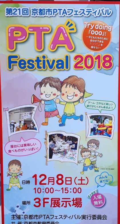 本日(12月8日)、左京区岡崎にあります「みやこめっせ」にて、PTAフェスティバルが、15:00まで行われています。PTAフェスティバルでは、模擬店やステージ発表、PTA壁しんぶんの展示などがあります。本校のPTA壁しんぶん(PTA学級委員担当者で製作)です。