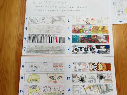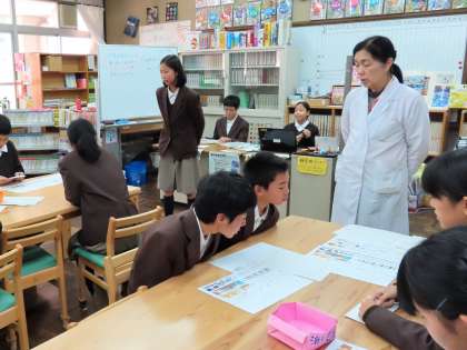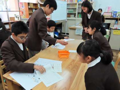 昼休みの図書室の様子です。図書室開館の横で、臨時の図書委員会が開かれていました。委員会では募集していた「しおり」が集まり、各クラスでコンテストの投票をしてもらうための説明です。