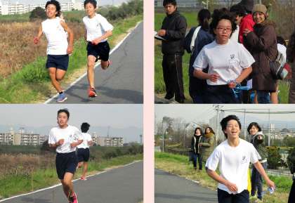 ゴール直前の様子とゴール後にPTAの方からスポーツドリンクを頂き、飲んでいる様子です。