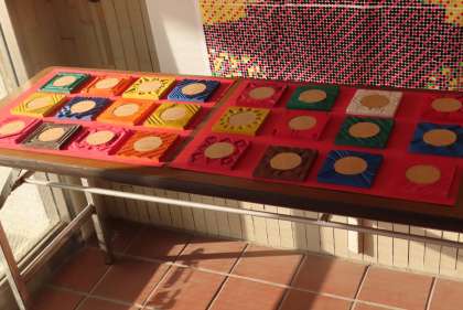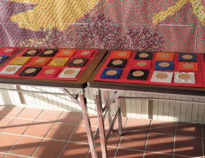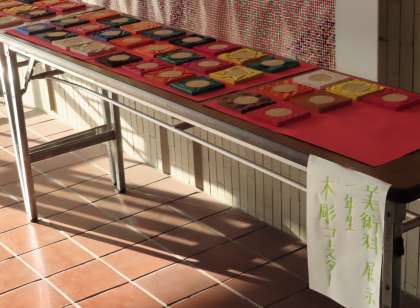 玄関に、1年生の美術の作品 〜 木彫コースター 〜 が展示されていました。