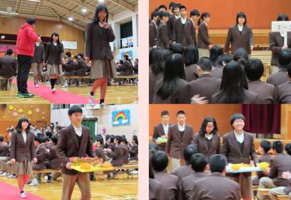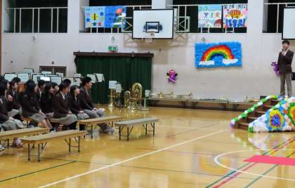 おわりの言葉と吹奏楽部の演奏に乗っての3年生退場の様子です。終始和やかなうちに、3年生を送る会は終了しました。3年生、これからも頑張ってください。