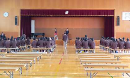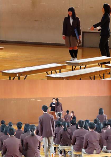 1限の様子です。明日の卒業式に向けて式の練習をしています。この後、式予行が行われます。