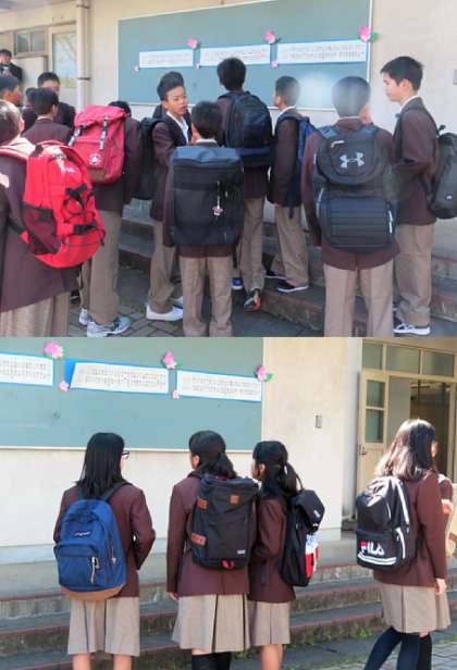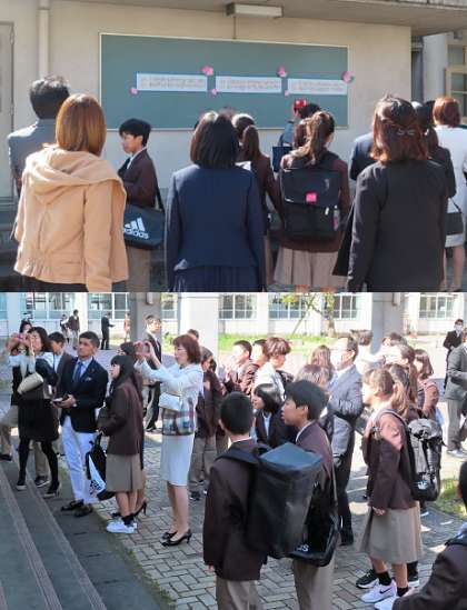 本日(4月9日)、平成31年度 第30回 入学式が行われ、74名の新入生を迎えました。入学式に先立ち、クラス発表が行われました。(クラス発表・受付の様子です。)
