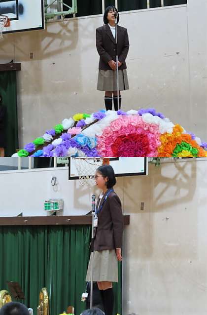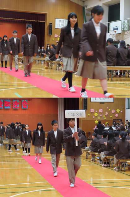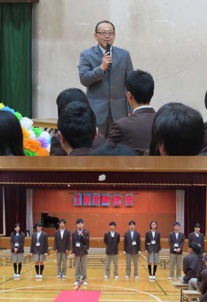 新入生を迎える会の様子です。終始和やかな雰囲気で迎える会が行われました。(新入生誓いの言葉・終わりの言葉・新入生退場・1年の先生よりのお礼の様子・生徒会本部役員からのあいさつ)