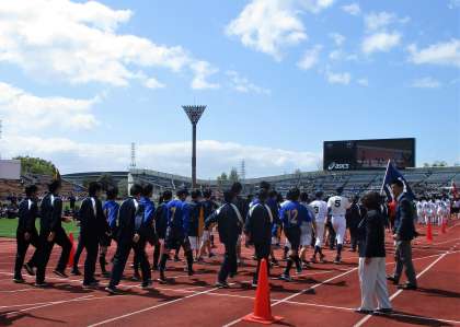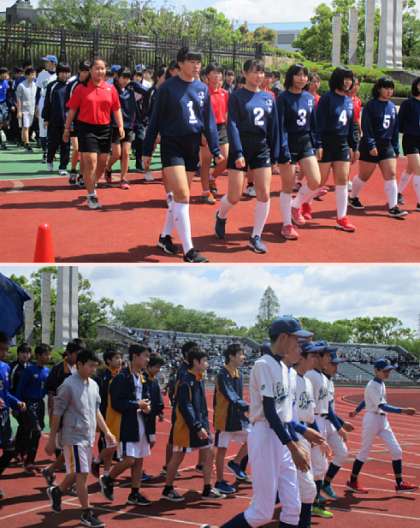 選手入場の様子です。少し風がふき肌寒さを感じる中、元気に行進しました。