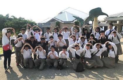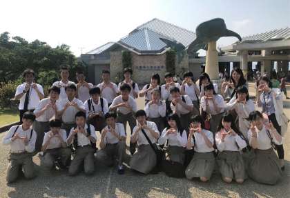 水族館前のジンベイザメのモニュメント前で学級写真を撮りました。上から、3組、4組、風景 です。