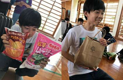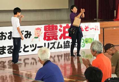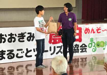 離村式。サプライズです。離村式の中で、大宜大宜味ツーリズムの方から本日誕生日の生徒にプレゼントを頂きました。
