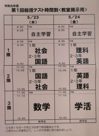 本日より、テスト一週間前になります。計画的に学習を行ってください。テストの時間割は