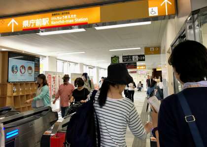 県庁前駅に到着し、ゆいレールを待っています。
