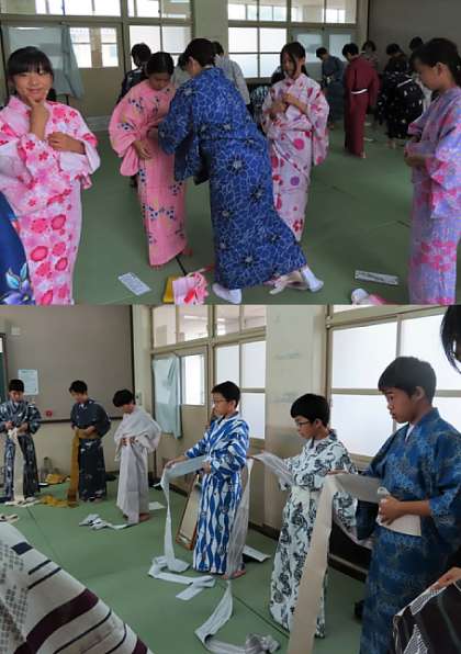 「古典の日に関する法律」施行を受け、「和装教育国民推進会議」と連携して行われる和装体験の授業が1年生で行われました。講師の先生3名に来て頂き丁寧に指導して頂きました。2限4組の様子です。