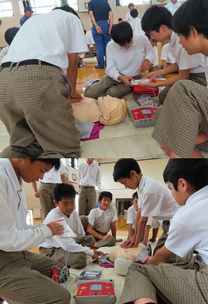 AED体験の様子と講習終了後、お世話になった皆さんにお礼の挨拶の様子です。ありがとうございました。