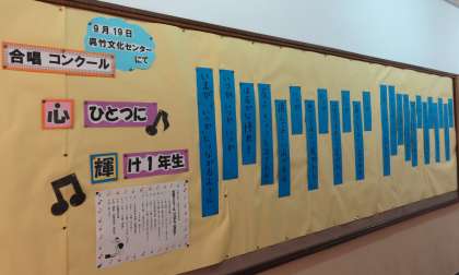 1年生の掲示板に今年度の合唱コンクールのプログラムと学年合唱の歌詞が掲示されていました。