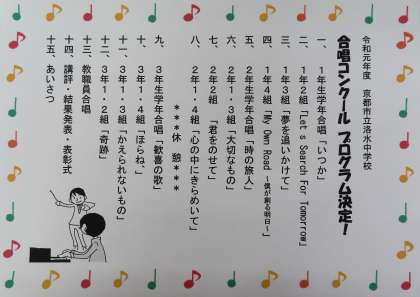 昨日、掲示物の中でお知らせしました、合唱コンクールのプログラムに間違いがありましたので、訂正版を掲載します。当日は、参観よろしくお願いします。