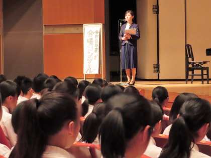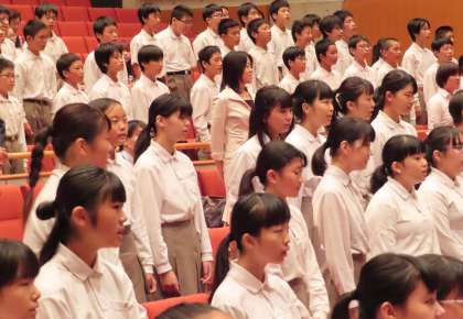 初めに諸注意などを済ませ、発声練習を兼ねて全員で校歌を斉唱しました。その様子です。