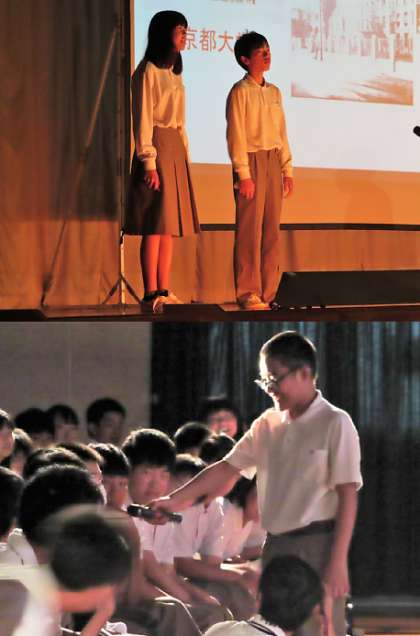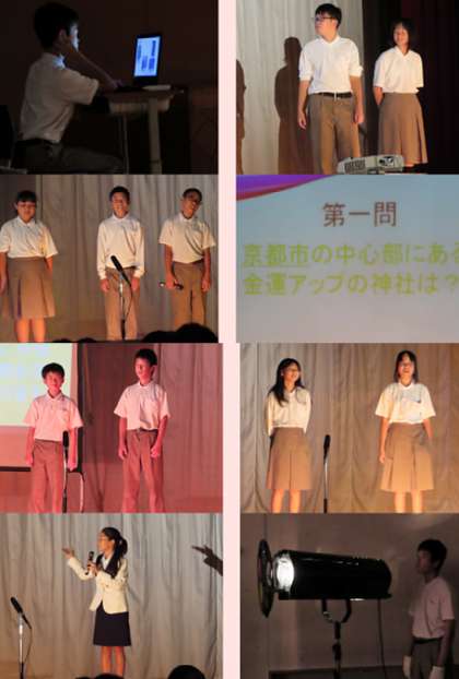 1年生の舞台発表は「京都再発見」です。自分たちが住んでいる京都について、色々な人たちに発信していけるよう歴史、名所、旧跡、食べ物、自然、伝統文化について調べてきました。その成果を京都ツアーのご提案として、みなさんに紹介します。皆さんもこの発表で京都を再発見してください。