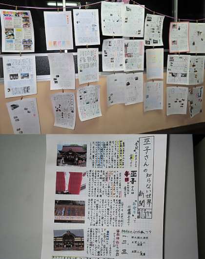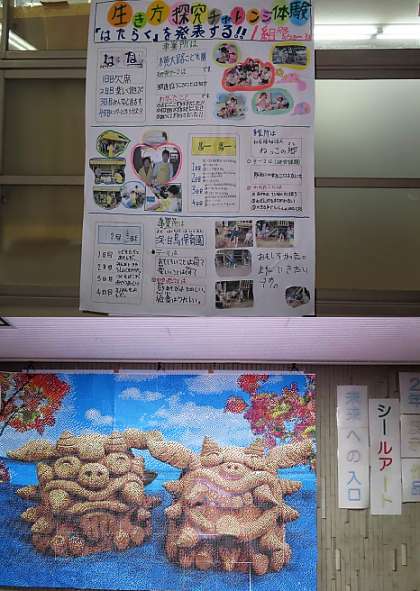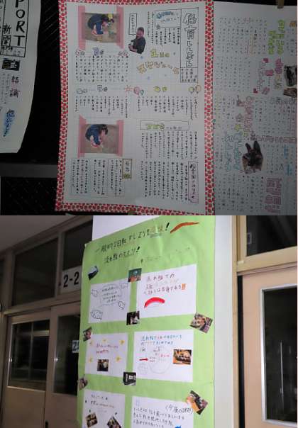 「2年総合学習『チャレンジ体験のしんぶんとポスター』」「2年シールアート〜未来の入り口〜」です。