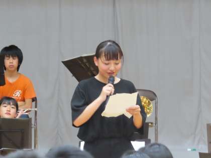 おわりの挨拶(学校祭実行委員長)の様子です。委員長から「今日の学習発表会はどうでしたか。各学年がこの半年間で取り組んできたことが伝わってくる内容ばかりでした。1、2年生は、先輩の発表を見て、これからの学んでいくことの予習になったと思います。3年生は1,2年の時を思い出し、学んだことを復習できたのではないでしょうか。どの学年も工夫をこらした発表や展示でとても楽しめた一日になったと思います。いよいよ残すは学校祭最後の行事、体育大会です。全力でぶつかり合い、クラスの絆を発揮してください。最後までみんなで輝ける学校祭にしましょう。」とあいさつがありました。
