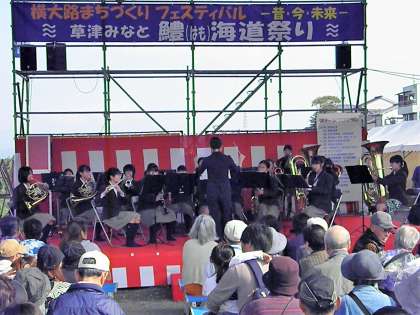 昨日(10月27日)、『桂川 草津みなと はも海道まつり』が、羽束師橋東詰 桂川河川敷にて、午前10時から開催されました。本校吹奏楽部が、出演し3曲演奏しました。