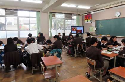 2限の授業の様子です。上から、2組 社会、3組 音楽、4組 理科 です。