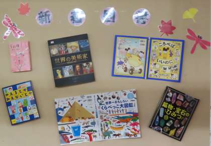 掲示物が新しくなりました。上が図書室前の新着図書の紹介、中下が行事予定等です。