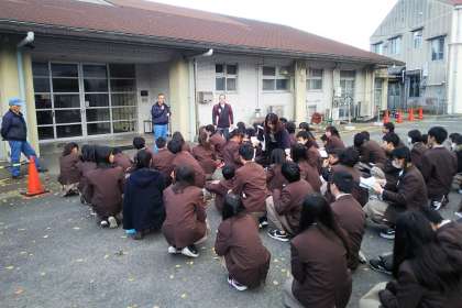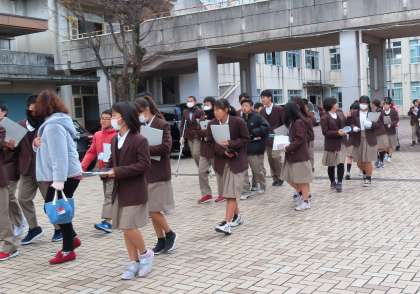 本日、1年生は、人権学習の一環として「横大路学園」を訪問します。「生徒に、障がいについての理解を深めさせ、互いに学び合い、共に生きる社会を築くための基礎を身につけさせる」ことを目標に横大路学園を訪問します。横大路学園では、施設を見学後、園長先生から講演をしていただきます。出発前と到着後の様子です。