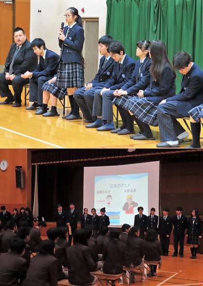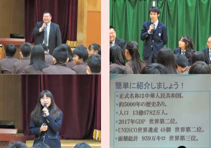 本日の3・4限、2年生は京都両洋高校の中国からの留学生に来て頂き、国際理解学習を行いました。3限は体育館で「学校や留学生の紹介、中国の紹介、中国語クイズ」などをしました。