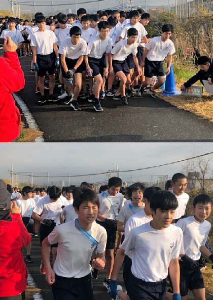 午前9時に3年男子がスタートして3分間隔で、3年女子、1年男子、1年女子、2年男子、2年女子の順に出発します。写真はスタートの様子です。上から、3年男子、3年女子、1年男子の順です。