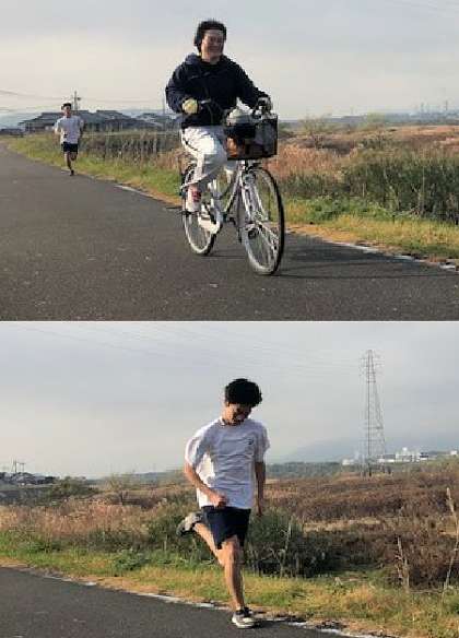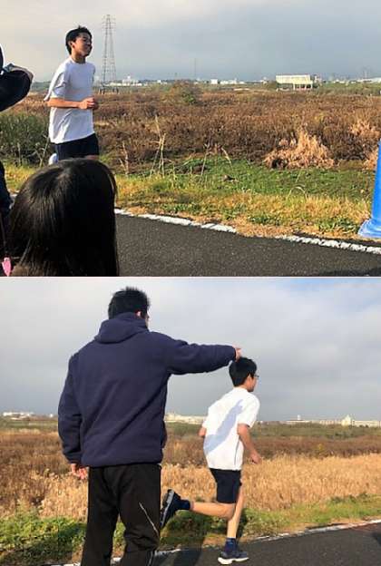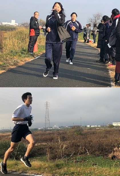 マラソン大会の様子です。先頭がスタート地点を通過して第2チェックポイントへ向かいます。また、徒歩コースに参加したメンバーがゴールしました。