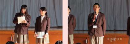 表彰後は、学校祭実行委員会・生徒会長・校長先生・生徒指導部からの話と続きました。校長先生からは1・2年生には家族と過ごす時間を大切にしてください。3年生には、受験(受検)は自分だけ頑張るのではなく、みんなで乗り越えて欲しい。ワンチームという言葉が流行語にもなったように3年生もみんなで頑張ろう。と激励の言葉もありました。